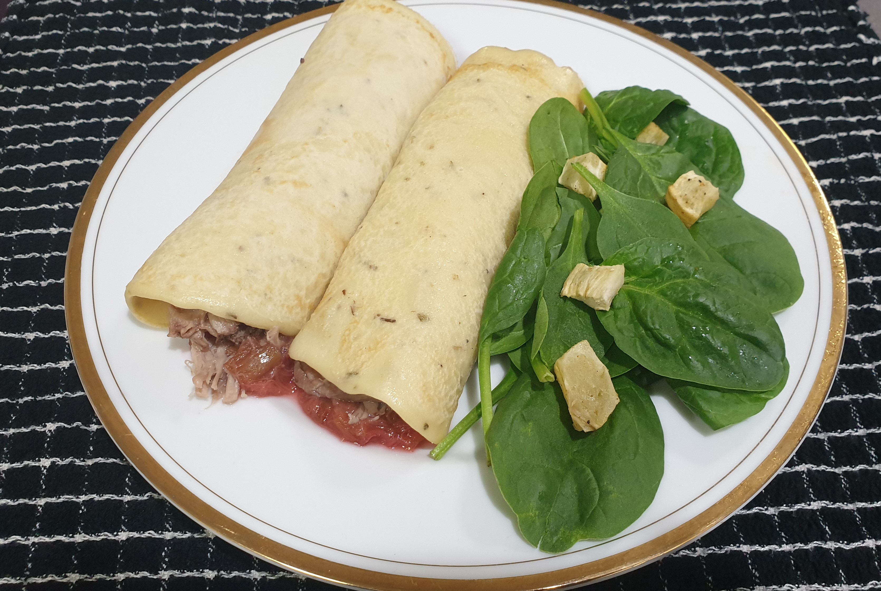 Method: Salt the pork roast and place in slow cooker with a half cup of salted water. Cook on low for 8 hours. Place the rhubarb, sugar and water in a saucepan and mix sugar through. Cover and cook on half heat until soft, stir until rhubarb loses its form. Pull small sections of pork apart and place into crepe or wrap and drizzle with stewed rhubarb. Roll crepe and serve with salad. |